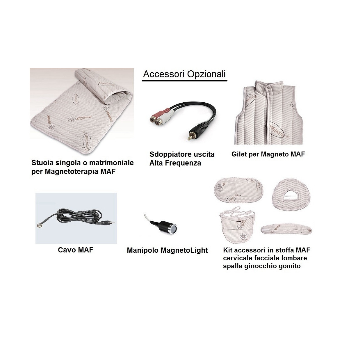 1 diffusore morbido per magneto ad Alta Frequenza o un accessorio in stoffa MAF (opzionali: materassino o accessori in stoffa per trattamenti localizzati)